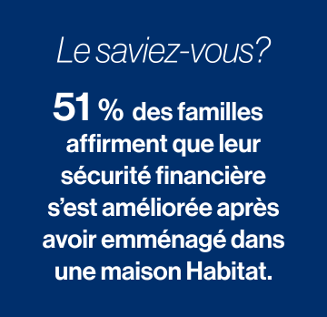 Des bénévoles de partout au pays sont venus l’aider à construire sa maison. Reconnaissante du soutien qu’elle a reçu, Michelle leur a rendu la pareille. Après avoir emménagé, sa famille s’est portée volontaire pour participer à la construction de sept autres maisons Habitat. Pendant la pandémie, les membres de sa famille ont fait équipe, en accrochant des cloisons sèches, en ponçant et en peignant, afin de redonner à la communauté qui les avait aidés.